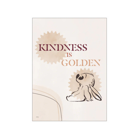 Ge ditt barns sovrum eller vardagsrum en touch av vänlighet och magi med denna vackra Disney-affisch från Poster & Frame. Motivet visar den älskade karaktären Stitch från Disneys universum som sitter sött och tittar upp, omgiven av texten ”Kindness is Golden” (Vänlighet är guld värt). Affischen är hållen i mjuka, neutrala nyanser som passar in i de flesta interiörer och skapar en lugn och mysig atmosfär. Det inspirerande budskapet påminner både barn och vuxna om att vänlighet alltid är värdefullt.
