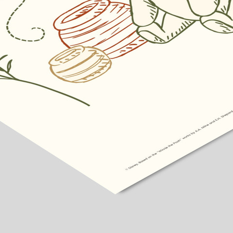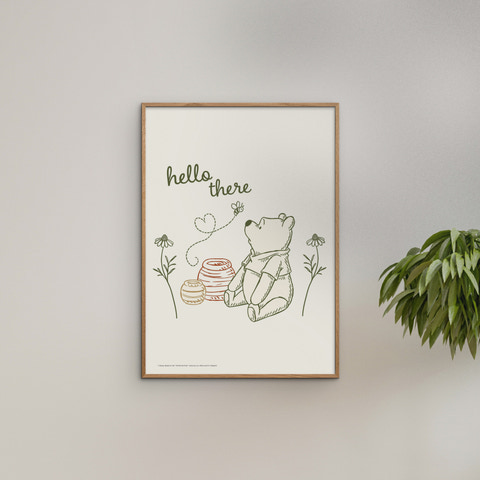 Ge ditt barns rum en mysig och äventyrlig touch med denna vackra affisch med Nalle Puh från Poster & Frame. Motivet föreställer den älskade björnen i en enkel och charmig design, sittande omgiven av honungskrukor och blommor, medan texten ”hello there” välkomnar dig. De mjuka, neutrala färgerna gör affischen lätt att matcha med andra dekorationer, och den passar perfekt i både klassiska och moderna interiörer. Affischen är tryckt på kraftigt papper så att den håller sig fin länge, och är en självklar presentidé för både barn och barnsliga själar som älskar de tidlösa berättelserna om Nalle Puh och hans vänner.
