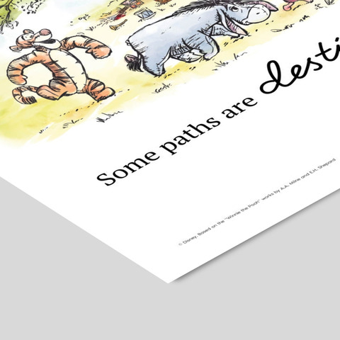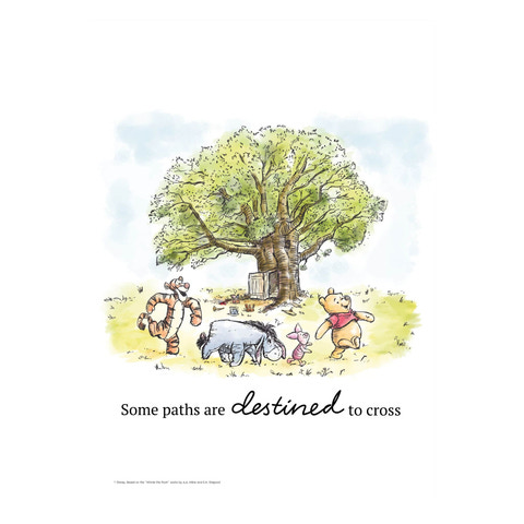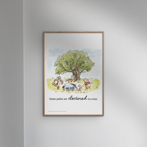 Denna affisch från Poster & Frame sprider mys och nostalgi i ditt hem med ett älskat motiv från Nalle Puh-universumet. Här samlas Nalle Puh, Nasse, Ior och Tiger under det stora trädet, där vänskap och äventyr blomstrar. Den delikata akvarellstilen och det inspirerande citatet gör affischen till ett självklart val för ett barnrum, men den passar också utmärkt i vardagsrummet eller som present till någon du bryr dig om. Affischen är tryckt på högkvalitativt material, så färgerna är vackra och klara, och den officiella Disney-licensen garanterar att du får en produkt med ett autentiskt utseende och hög standard.