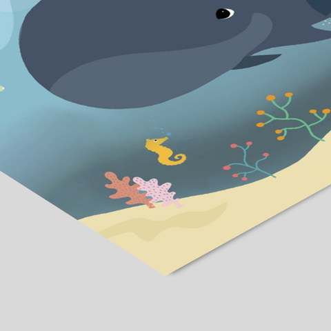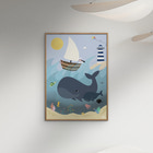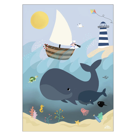 Ge ditt barns rum en sagolik känsla med denna charmiga affisch ”Whales and Waves” från Poster & Frame. Affischen har ett färgglatt och fantasifullt motiv med glada valar, vågor, ett segelfartyg, en fyr och roliga havsdjur, som tillsammans skapar en livlig och inspirerande atmosfär. Den stora A3-storleken gör affischen till en vacker blickfångare som kan hängas ensam eller kombineras med andra affischer för en personlig touch. Motivet är tryckt på högkvalitativt material, så färgerna framträder klara och inbjudande. Perfekt som presentidé eller för att skapa mysighet och glädje i barnrummet.