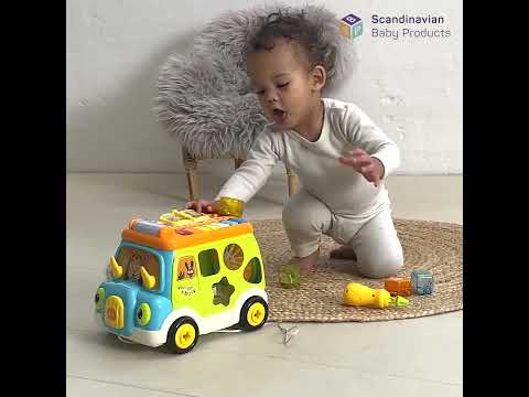 Rolig och lärorik aktivitetsbuss från Scandinavian Baby Products. Bussen har många funktioner: sorteringslåda, spela melodier, spela piano och skruva av hjulen med det tillhörande vertyget eller dra bussen efter dig. Batterier placeras högst upp på bussens tag genom att ta bort lådan med en skruvmejsel. Detta ska hanteras av en vuxen, och lådan ska slutas korrekt efter batteribyte.