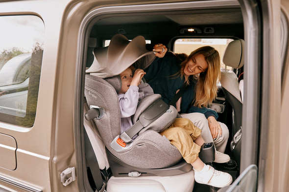 Kom ihåg att använda ett sittskydd för att skydda bilbarnstolen från märken efter bilbarnstolen/basen. En förvaringsficka gör att ditt barn kan ha leksaker, en vattenflaska och snacks nära till hands, och solskydd på fönstren skyddar dem från den starkaste solen.