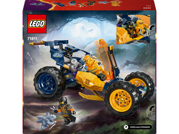 Pojkar och flickor från 7 år kan återskapa spännande strider från säsong 2 av tv-serien NINJAGO ® Drakarna vaknar med LEGO® NINJAGO® Arins terrängbuggy (71811). Detta äventyrsset för barn innehåller ett leksakfordon i Arins gula färg med rörliga hjul, fjädring, öppningsbar cockpit med plats för 2 minifigurer, 2 knoppkanoner med 6 knoppar att avfyra och en stor krok baktill för att fånga skurkar.