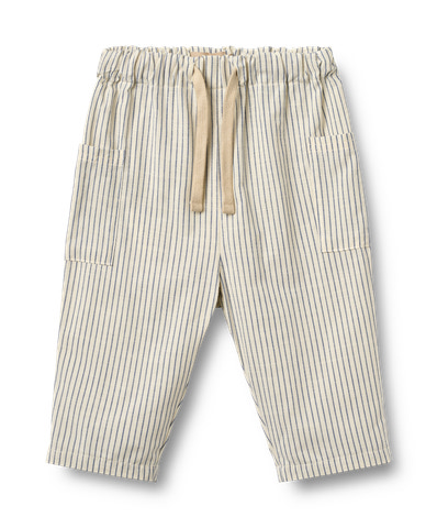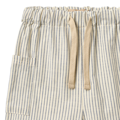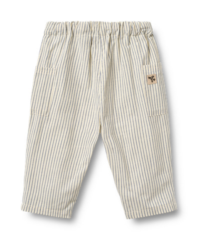 Arne Byxor från Wheat är ett par stilrena och bekväma barnbyxor i ekologisk bomull, perfekta för både vardag och fest. Den mörkblå randiga designen ger ett tidlöst uttryck, medan den mjuka bomullen känns skön mot huden. Byxorna har en elastisk midja med justerbart snöre, vilket gör dem enkla att ta på och av samt ger en flexibel passform som växer med barnet. De två praktiska fickorna framtill är perfekta för små skatter och leksaker. Materialet är lätt och andas, vilket gör byxorna idealiska för aktiva dagar och lek både inne och ute. Ett hållbart och miljövänligt val för barnets garderob!
