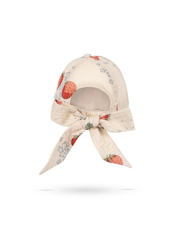 Mjuk keps tillverkad i skrynkligt seersucker-bomullstyg. Designad med en fast skärm framtill och en mjuk, dekorativ rosett som knyts bak.