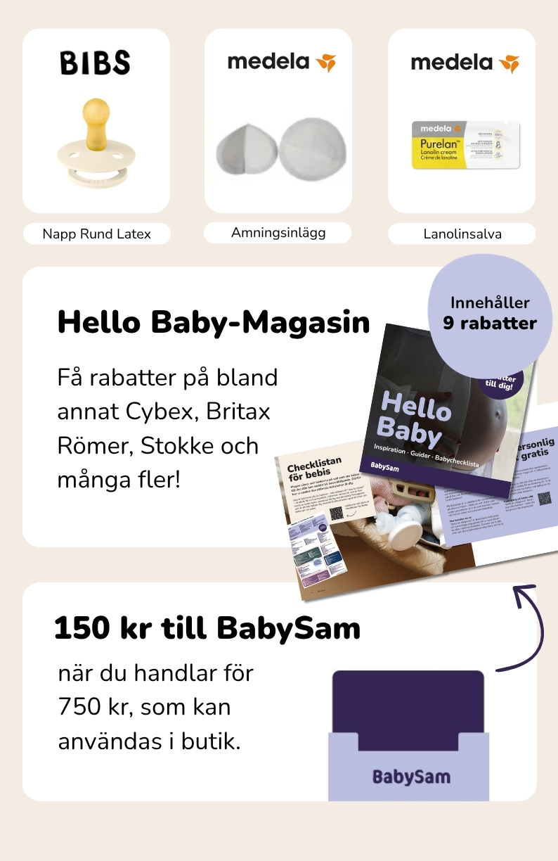 Innehållet i Babypaketet är noggrant utvalt och uppdateras flera gånger om året, vilket innebär att det kan variera. Paketet kan innehålla produkter som napp, blöjor, amningsinlägg, nappflaska, tvättlappar och lanolinkräm – samt unika rabatter. Du får också alltid vårt Hello Baby Mini-magasin, fylld med inspiration, erbjudanden och en kupong på 150 kr att använda i din lokala BabySam-butik.