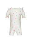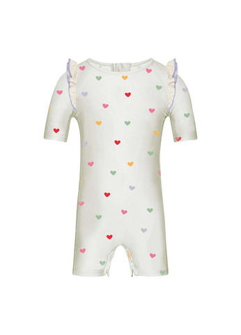 Baddräkt - Hearts - Cream från Vanilla COPENHAGEN är en charmig och lekfull baddräkt för de minsta. Den krämfärgade basen pryds av små hjärtan i olika färger, vilket ger ett glatt och somrigt uttryck. Materialet är mjukt och elastiskt, vilket gör att baddräkten sitter bekvämt och följer barnets rörelser under både lek och simning. De korta ärmarna och volangdetaljerna på axlarna ger en extra söt touch, samtidigt som dragkedjan bak gör det enkelt att ta på och av plagget. Perfekt för stranddagar, simskola eller poolhäng – en baddräkt som kombinerar funktion och stil på bästa sätt!