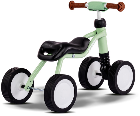 Den främre svängbara axeln på PUKY® WUTSCH® möjliggör en platt styrvinkel, vilket stabiliserar fordonet när det stöter på mindre hinder. Barn från 1½ år som redan kan gå säkert kan också röra sig säkert på mindre jämna underlag.