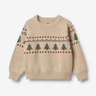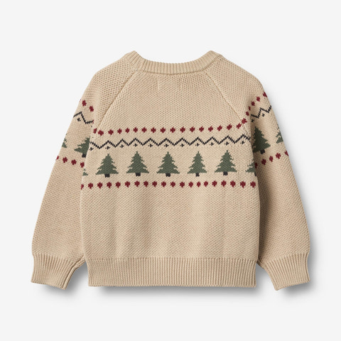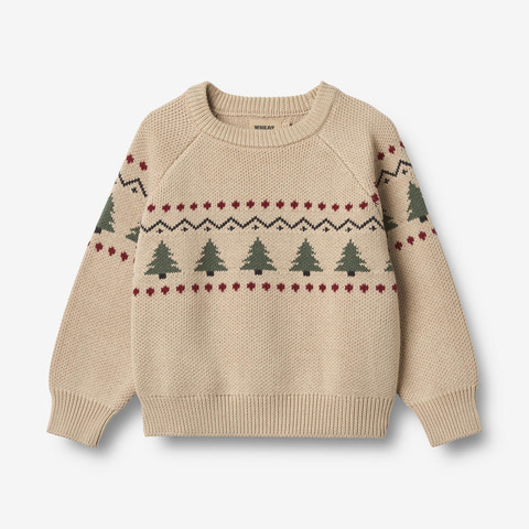 Vacker stickad tröja med julmotiv i mjuk ekologisk bomull för barn. Wheats stickade plagg är ett måste när vinterkylan närmar sig. Denna stickade tröja utstrålar julstämning med sitt fina tryck av julgranar. Perfekt till byxor, kjolar och klänningar, både till julfesten och mysiga helger hemma. Bär den som ett extra lager under en jacka för att hålla ditt barn varmt hela säsongen.