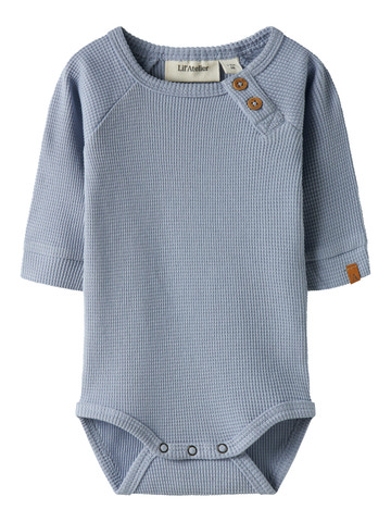 Balto Långärmad Body från Lil' Atelier är ett underbart basplagg för de minsta, tillverkat i mjuk och ekologisk bomull som känns skön mot barnets hud. Den långärmade modellen håller barnet varmt och bekvämt, medan de fina träknapparna på axeln gör det enkelt att ta av och på bodyn. Med sin klassiska Zen Blue-färg och diskreta struktur passar den lika bra till vardags som till festligare tillfällen. Bodyn har tryckknappar i grenen för smidiga blöjbyten och är ett hållbart val för både barn och miljö.