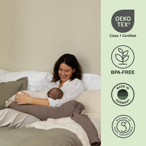 Bbhugme® amningskudden ger dig allt det bekväma stöd du behöver när du ammar eller ger barnet flaska, oavsett om du är hemma eller ute. Den anpassar sig efter din kropp och ditt barns förändrade behov allteftersom det växer. Din Bbhugme® amningskudde garanterar maximal komfort för dig och stöd för ditt barn i den ”höjd” som fungerar bäst för er båda – detta minskar belastningen på din nacke och dina axlar. Det tvättbara överdraget är mjukt och andas, och tillverkat av 95 % bomull och 5 % spandexjersey, vilket gör det enkelt att anpassa runt kudden. Ändstyckena ger dig möjlighet att justera kuddens storlek, fasthet och form när du vill. Dessa är tillverkade av BPA-fri silikon. Bind kudden runt midjan så märker du hur behagligt och bekvämt du kan amma eller ge flaska utan att belasta nacke eller axlar. Bbhugme® amningskudden kan användas till mer än bara amning, den är också fantastisk under graviditeten som extra stöd för den växande magen. Bbhugme® amningskudden är designad i Norge och inspirerad av en enkel, elegant skandinavisk design.