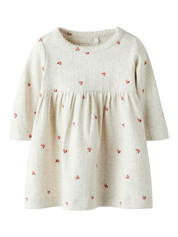 Berries Klänning - Peyote Melange från NAME IT är en charmig och bekväm klänning för de minsta. Tillverkad i en mjuk bomullsblandning med 5% elastan, ger den både rörelsefrihet och komfort hela dagen. Den ljusa melerade färgen pryds av små bär, vilket ger ett lekfullt och sött intryck. Klänningen har lång ärm och en lätt utställd kjol, vilket gör den perfekt för både lek och finare tillfällen. Ett utmärkt val för dig som vill ha både stil och funktion i barnets garderob.