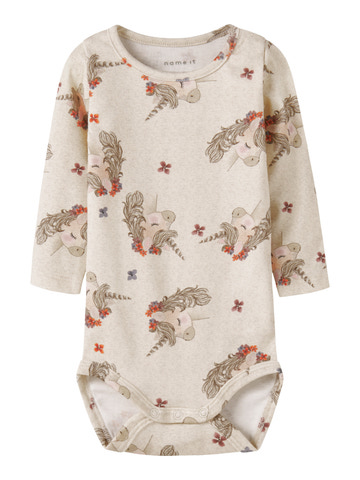 Fräscha upp ditt barns garderob med mjuka och praktiska bodys som är perfekta att använda året runt. Ribbstickningen har ett vertikalt randigt mönster och god elasticitet för en bekväm känsla och en tidlös look. - Produkttyp: Body - Halsringning: Rund halsringning - Ärm: Långa ärmar (L/S) - Stängning: Tryckknappar - Tryck: Tryck över hela produkten, glittertryck för en glittrande och cool look - Varning: VARNING! Hålls borta från öppen eld