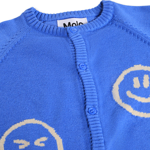 Brody Cardigan från Molo är en vacker och färgglad kofta som kommer att glädja alla garderober. Den är tillverkad av mjuk bomull som känns skön mot huden och passar perfekt både till vardags och fest. Kofta har en vacker blå färg och är dekorerad med roliga, ljusa smileys som ger den ett lekfullt utseende. Den klassiska knäppningen gör det enkelt att ta på och av cardiganen, medan ribbade kanter på ärmarna och nederkanten säkerställer en bra och bekväm passform. Brody Cardigan är idealisk för lager-på-lager-styling och kan kombineras med både byxor och kjolar.