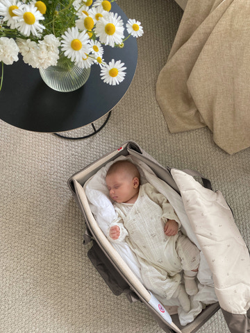 Se alltid till att placera Carry Me på ett plant underlag så att barnet inte rullar ut. Denna produkt uppfyller de uppdaterade kraven i den europeiska standarden EN 1466:2023 avseende säkerhet. Lämna aldrig barnet utan uppsikt. Det rekommenderas inte att använda denna produkt för samsovning.