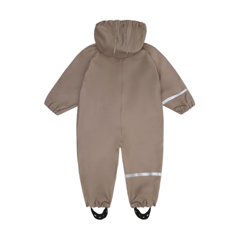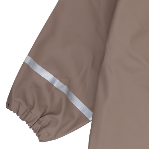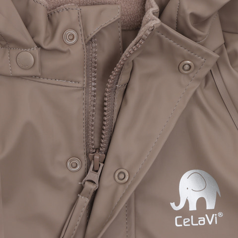 Superpraktisk CeLaVi regndräkt i enfärgat, slitstarkt PU-material med den söta CeLaVi-elefanten på bröstet. Dräkten är vind- och vattentät med svetsade sömmar och har ett uppmätt vattenpelartryck på 5000 mm. Praktisk elastisk kant vid handleder och anklar, samt justerbara elastiska stövelremmar längst ner på benen. Dräkten stängs framtill med dragkedja och tryckknappar. Reflexrand på höger arm och ben, samt avtagbar huva med tryckknappar.