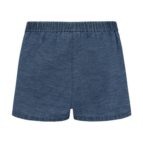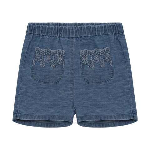 Chambray Shorts - Faded Denim från Minymo är ett utmärkt val för din sommargarderob. Dessa shorts är tillverkade av ett mjukt och lätt chambraytyg som känns skönt mot huden och ger aktiva barn stor rörelsefrihet. Shortsen har en vacker, dämpad denimfärg som passar till det mesta, och de två framfickorna är dekorerade med fina broderade blommor som ger en feminin och lekfull touch. Den elastiska midjan gör att shortsen sitter bra och är bekväma, oavsett om ditt barn leker, cyklar eller kopplar av. Shortsen är lätta att ta på och av och kan stylas med både T-shirts och blusar för en avslappnad och somrig look.