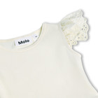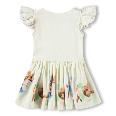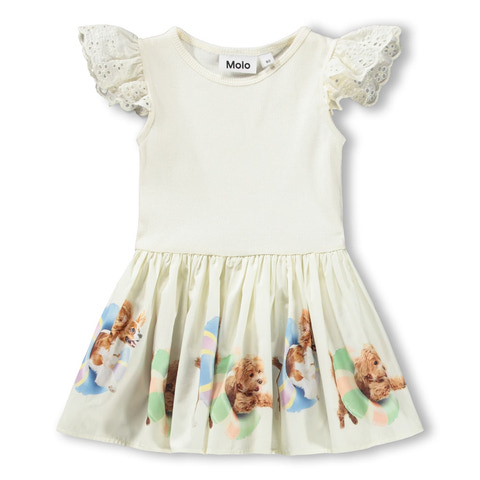Cimi Klänning - Beach Fun från Molo är en underbar sommarklänning som kombinerar komfort med lekfull design. Klänningen har en ribbad, mjuk överdel i bomull som ger en skön känsla mot huden, medan kjolen pryds av ett färgglatt strandmotiv med söta hundar. Volangärmarna i broderad spets ger en extra touch av elegans och gör klänningen till ett riktigt blickfång. Den stretchiga överdelen och den rymliga kjolen gör att barnet kan röra sig fritt och bekvämt, oavsett om det är lek på stranden eller kalas med vänner. Klänningen är lätt att ta på och av, och passar lika bra till vardags som till fest.