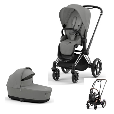 e-PRIAM Chassi & Sittbas passar med liggdel, sittdel, babyskydd och mjuklift för smidig och bekvämt resande med ditt barn.