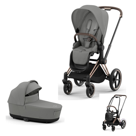 Cybex E-Priam Chassit har skumfyllda punkteringsfria hjul där dem främre hjulen är rörliga men går att låsa vid tuffare terräng. Fjädring över alla fyra hjulen vilket ger en behaglig tur för så väl barn som förälder. Stor varukorg som går att fälla ut för att få plats med ännu mer. Maxvikt på 5 kg i varukorgen. Chassit har ett teleskopshandtag klädd i lyxig läderimitation som går att justera i 4 olika lägen. Passar både längre och kortare föräldrar. Chassit går enkelt att fälla ihop med bara en hand. Sittdelen går även att fälla tillsammans med vagnen både när den är framåtvänd och bakåtvänd. Travelsystem, klicka enkelt på Cybex, besafe eller Maxi-Cosi babyskydd direkt på chassit. Höjden på sittdelen anpassad efter standarden för matbord. Kör bara in vagnen intill bordet så har ni en säker matstol under restaurangbesöket.