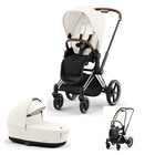 Cybex E-Priam Chassit har skumfyllda punkteringsfria hjul där dem främre hjulen är rörliga men går att låsa vid tuffare terräng. Fjädring över alla fyra hjulen vilket ger en behaglig tur för så väl barn som förälder. Stor varukorg som går att fälla ut för att få plats med ännu mer. Maxvikt på 5 kg i varukorgen. Chassit har ett teleskopshandtag klädd i lyxig läderimitation som går att justera i 4 olika lägen. Passar både längre och kortare föräldrar. Chassit går enkelt att fälla ihop med bara en hand. Sittdelen går även att fälla tillsammans med vagnen både när den är framåtvänd och bakåtvänd. Travelsystem, klicka enkelt på Cybex, besafe eller Maxi-Cosi babyskydd direkt på chassit. Höjden på sittdelen anpassad efter standarden för matbord. Kör bara in vagnen intill bordet så har ni en säker matstol under restaurangbesöket.