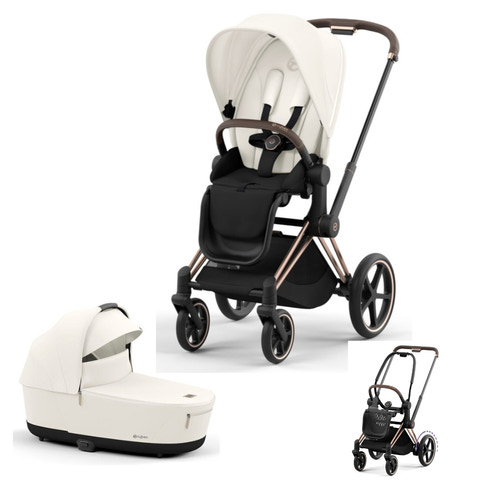 Cybex E-Priam Chassit har skumfyllda punkteringsfria hjul där dem främre hjulen är rörliga men går att låsa vid tuffare terräng. Fjädring över alla fyra hjulen vilket ger en behaglig tur för så väl barn som förälder. Stor varukorg som går att fälla ut för att få plats med ännu mer. Maxvikt på 5 kg i varukorgen. Chassit har ett teleskopshandtag klädd i lyxig läderimitation som går att justera i 4 olika lägen. Passar både längre och kortare föräldrar. Chassit går enkelt att fälla ihop med bara en hand. Sittdelen går även att fälla tillsammans med vagnen både när den är framåtvänd och bakåtvänd. Travelsystem, klicka enkelt på Cybex, besafe eller Maxi-Cosi babyskydd direkt på chassit. Höjden på sittdelen anpassad efter standarden för matbord. Kör bara in vagnen intill bordet så har ni en säker matstol under restaurangbesöket.