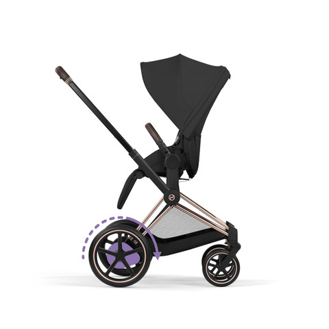 Cybex e-Priam förenar toppmodern teknik med en verklig designikon och revolutionerar lyxig komfort och exklusiv design för att möta föräldrarnas högsta förväntningar. Cybex e-Priam – en barnvagn som ger föräldrar eldriven frihet redan från början. Den gör varje tur jämn på ojämnt underlag och gör kullersten, parkstigar och sandiga promenader till en lek. En innovativ vaggfunktion, som styrs via e-Priams app, rör automatiskt barnvagnen mjukt fram och tillbaka för att lugna barnet och hjälpa det att natta. Det är vid bakaxeln som magin sker. De två elmotorerna är diskret placerade bakom hjulen och är så tysta att ditt barn kan sova ostört. Batteri, laddningsindikator och på/av-knapp är harmoniskt integrerade i e-Priams tidlösa design.