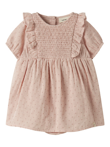 Dembe Bodyklänning från Lil' Atelier är en charmig och bekväm klänning för de minsta, tillverkad i mjuk ekologisk bomull som är snäll mot barnets hud. Den har en vacker smock upptill, volangärmar och en luftig kjol som ger en lekfull känsla. Klänningen är lätt att ta av och på tack vare praktiska tryckknappar i grenen, vilket underlättar vid blöjbyten. Den ljusa Peach Whip-färgen och de diskreta prickarna gör plagget extra fint för både vardag och fest.
