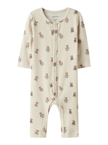 Denkab Jumpsuit från NAME IT är ett underbart plagg för de minsta, tillverkat i en mjuk och stretchig blandning av ekologisk bomull, modal och elastan. Den ribbade strukturen ger en skön känsla mot huden och den söta björnprinten gör jumpsuiten extra charmig. Med tryckknappar framtill och i grenen blir blöjbyten och påklädning smidiga och snabba. Perfekt för både lek och vila, och tack vare de hållbara materialen är jumpsuiten ett tryggt val för både barn och miljö.