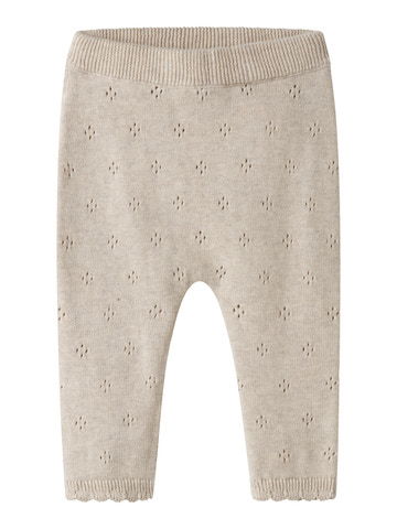 Diame Knit Byxor från NAME IT är ett underbart tillskott till barnens garderob. Byxorna är stickade i ekologisk bomull, vilket gör dem både mjuka och skonsamma mot barnets hud. Det fina hålmönstret ger en klassisk och söt känsla, samtidigt som den neutrala färgen Peyote Melange gör dem enkla att matcha med andra plagg. Med resår i midjan sitter byxorna bekvämt och är lätta att ta av och på, vilket underlättar vid blöjbyten och lek.