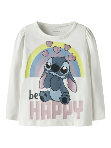 Diana Stitch Sweater - Cloud Dancer från NAME IT är en söt och bekväm tröja för barn som älskar Disneys värld. Tröjan är tillverkad i mjuk bomull som känns skön mot huden och garanterar komfort hela dagen. Det charmiga Stitch-trycket med glittrande hjärtan och texten ”be HAPPY” ger en lekfull och färgglad look som får både barn och vuxna att le. Tröjan har långa ärmar och en klassisk rund hals, vilket gör den perfekt både för vardagsbruk och mysiga stunder. Perfekt för att sprida glädje och god energi i din garderob!