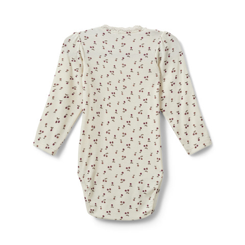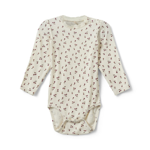 Denna bedårande bodysuit från Petit by Sofie Schnoor är designad i en mjuk benvit färg med ett delikat tryck av små körsbär. Bodysuiten har långa ärmar och praktiska tryckknappar vid axeln, vilket gör den lätt att ta på och av – perfekt för både lek och vila.