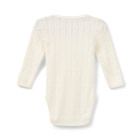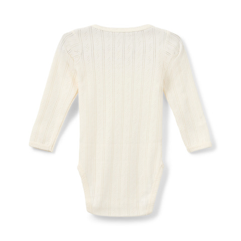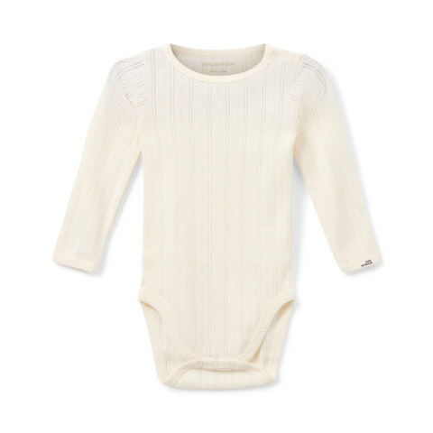 Ge ditt barn en body som kombinerar komfort med ett elegant uttryck. Denna fina body med hålmönster är tillverkad i en mjuk och andningsbar bomullskvalitet som känns skön mot huden och ger ett lätt och luftigt utseende. Det delikata mönstret tillför en touch av nostalgi och charm som passar perfekt både till vardags och till festligare tillfällen.