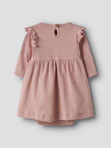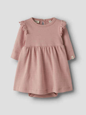 Dimia Bodyklänning från Lil' Atelier är en charmig och bekväm bodyklänning i en mjuk bomullsblandning med elastan, vilket ger både rörelsefrihet och en skön känsla mot huden. Klänningen har fina volangdetaljer på axlarna och en klassisk rund halsringning, vilket gör den extra söt. Den praktiska knäppningen bak och i grenen underlättar vid blöjbyten och påklädning. Med sin långärmade design och den vackra färgen Misty Rose passar den lika bra till vardags som till festliga tillfällen.