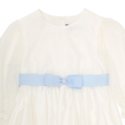 Doprosett i ribbad satin som knyts på baksidan. Den länkade rosetten fästs framtill på midjan med den medföljande säkerhetsnålen. Bredd 3 cm.