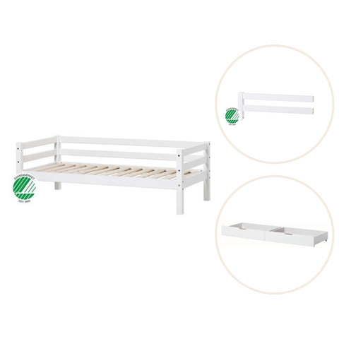 Hoppekids juniorsäng i storleken 70x160 cm är den perfekta basen för en barnsäng. Sängen kan användas separat eller tillsammans med en av de smarta modulerna. När den används separat är sängen perfekt som dagbädd eller bäddsoffa. Det finns gott om förvaringsutrymme under sängen – till exempel med de stora, rymliga lådorna på hjul från Hoppekids, som finns som tillval. Den lilla storleken på 70x160 cm gör sängen perfekt för små rum eller för barn som ännu inte är redo för en vuxensäng. Det finns fortfarande gott om utrymme att växa utan att sängen känns stor och osäker.