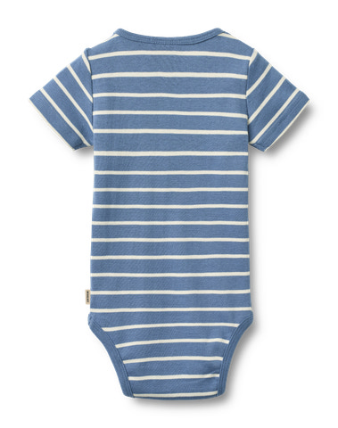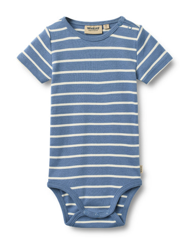 Edvald Kortärmad Body från Wheat är ett perfekt val för små barn under sommarens varma dagar. Den är tillverkad av mjuk och ekologisk bomull som känns skonsam mot barnets känsliga hud. Den klassiska blå/vita randen ger ett tidlöst och fräscht utseende, medan de praktiska tryckknapparna vid axeln och i grenen gör det enkelt att klä på och av barnet. Den korta ärmen ger extra komfort och rörelsefrihet, och materialet andas väl för att hålla barnet svalt. En body som kombinerar funktion, komfort och stil – perfekt för både lek och vila.