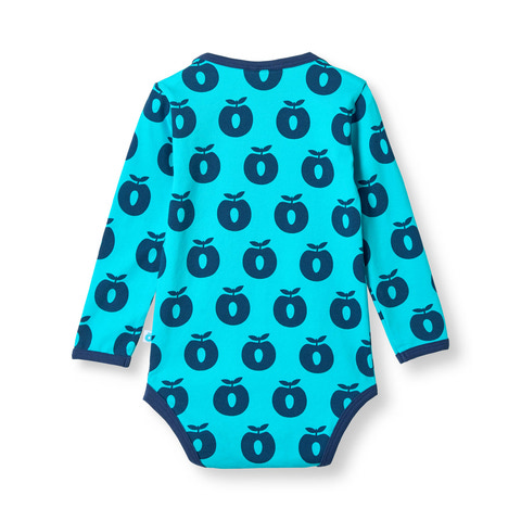 Långärmad babybody med äpplen, tillverkad i ekologisk och stretchig bomullsjersey. Denna body är OEKO-TEX Standard 100®-certifierad, vilket innebär att den är tillverkad och testad för skadliga ämnen så att du kan ta hand om ditt barns hud och hälsa.Bodyn har en normal passform med kuvertknäppning och tryckknappar samt ribbade kanter i hals och ärmar. Småfolks bodys är designade i Danmark med tanke på att tåla otaliga äventyr och lek och behålla form och färg även efter upprepad användning.