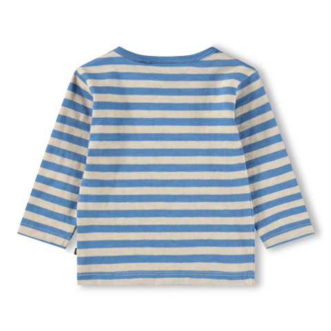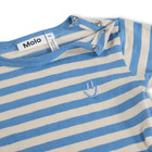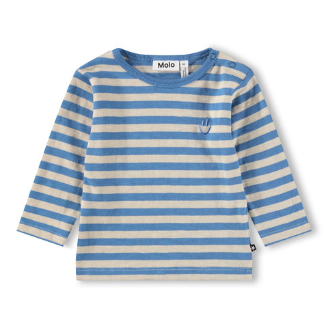 Elvo T-shirt från Molo är en bekväm och stilren långärmad tröja till de minsta. Den är tillverkad av 100% ekologisk bomull, vilket gör den extra mjuk och skonsam mot barnets hud. Den klassiska randiga designen i blått och beige ger ett tidlöst uttryck, och de praktiska tryckknapparna vid axeln underlättar när du ska klä på eller av ditt barn. Tröjan har en broderad Molo-logga på bröstet och passar lika bra till vardags som till festliga tillfällen. Ett hållbart och snyggt val för barnets garderob!