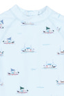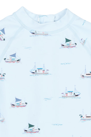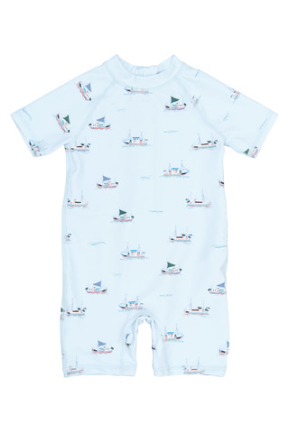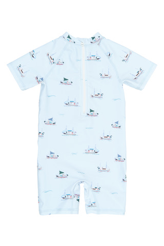 Emmet Baddräkt från Petit Piao är det perfekta valet för sommarens bad och strandäventyr. Den charmiga baddräkten har ett lekfullt båtmönster på en ljusblå bas och är tillverkad i en mjuk blandning av polyester och elastan som ger både komfort och rörelsefrihet. Med korta ärmar och ben skyddas barnets hud mot solen, samtidigt som materialet torkar snabbt efter bad. Den praktiska dragkedjan gör det enkelt att klä på och av baddräkten, vilket är extra smidigt vid strandbesök eller simlektioner. Perfekt för aktiva barn som älskar vattenlek!
