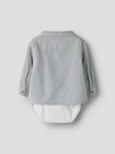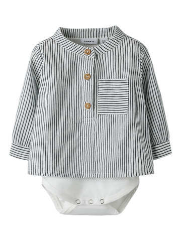 Far Långärmad Skjortbody från NAME IT är ett perfekt plagg för både vardag och fest. Den är sydd i ekologisk bomull som känns mjuk och behaglig mot barnets hud, samtidigt som den är snäll mot miljön. Skjortbodyn har ett tidlöst randigt mönster i färgen Cloud Dancer Navy Blazer, en klassisk krage och fina träknappar framtill. Den smarta bodymodellen med tryckknappar i grenen gör det enkelt att byta blöja och håller plagget på plats hela dagen. En liten bröstficka ger en extra söt detalj och gör skjortbodyn både praktisk och stilren.