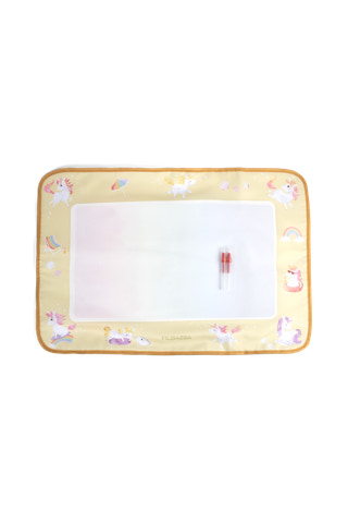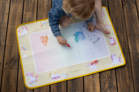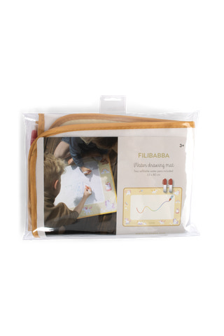 En stilla stund, en lätt penseldrag med vatten – och plötsligt blommar färgerna ut som genom ett trollslag. På denna drömlika vattenmålningsmatta kan små konstnärer se sin fantasi väckas till liv i mjuka regnbågsnyanser – helt utan kladd eller färgstänk. Du behöver inte använda färg eller tuschpennor – fyll bara en av de två medföljande pennorna med vatten och se färgerna komma till liv. Ett lugnt och lekfullt sätt att utforska kreativiteten om och om igen. Mattan är tillräckligt stor för att två barn ska kunna rita sida vid sida, och när konstverket torkar är ytan redo för nya äventyr. Den är lätt och enkel att vika ihop med en praktisk rem – perfekt både för lek hemma och att ta med på resan, från vardagsrumsgolvet till den soliga picknickfilten.