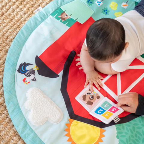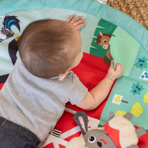 Utforska en hel gård full av kul och lärande med aktivitetsmattan Happy Harvest från Baby Einstein. Denna färgglada aktivitetsmatta från världens ledande tillverkare av aktivitetsmattor* är designad för att engagera bebisar i sensorisk lek och stödja utvecklingen av motorik. Tre sätt att leka: ligga ner och leka, magetid och sitta upp. Den mjuka och stödjande lekmattan har 5 sensoriska överraskningar för babyn: utforska det mjuka molnet, känn den släta satängsolen, öppna ladugårdsdörrarna och fönstret, eller titta bakom gräset för att hitta en gömd djurvän.