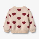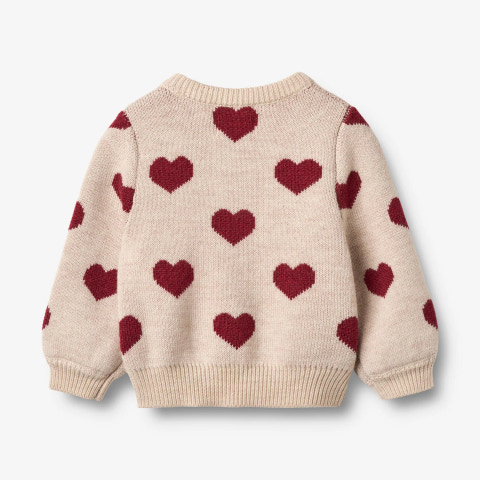 Långärmad stickad kofta i mjuk merinoull för ditt barn. Wheats stickade plagg är ett måste när vinterkylan närmar sig. Denna kofta utstrålar julstämning med sitt söta hjärtmönster. Perfekt till bodys, leggings och klänningar, både till julfesten och mysiga helger hemma. Bär den som ett extra lager under en jacka för att hålla ditt barn varmt hela säsongen.