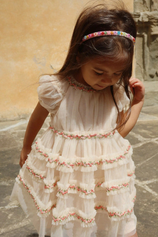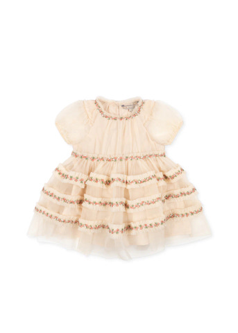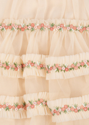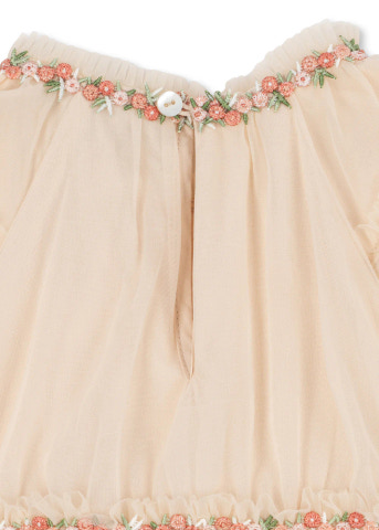 Mjuk tyllklänning med elegant volym. Joelle har en lagerklänning, korta puffärmar och blomapplikationer som ger en romantisk look.
