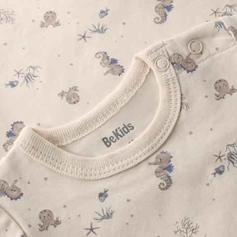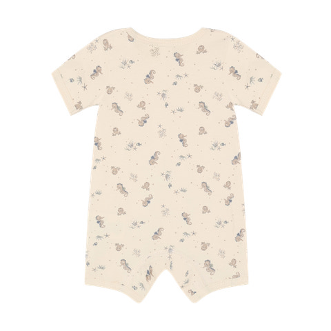 Söt, kortärmad romper med heltäckande tryck från BeKids. Rompern är tillverkad av en mjuk bomullsblandning och har ett sött sjöhästtryck över hela plagget. Knäpps med tryckknappar på axeln och mellan benen.