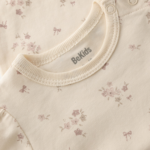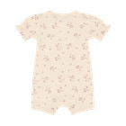 Söt, kortärmad romper med heltäckande tryck från BeKids. Rompern är tillverkad i en mjuk bomullsblandning och har ett sött blommönster över hela plagget. De söta puffärmarna ger den en fin look. Knäpps med tryckknappar på axeln och mellan benen.