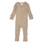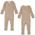 Härlig jumpsuit i mjuk merinoull med ribbstickning. Jumpsuiten knäpps framtill med tryckknappar och har vändbara fötter och händer. Dräkten är perfekt för små barn och håller dem varma och mysiga. De vändbara fötterna och händerna kan vikas efter behov. Denna jumpsuit finns i storlekarna 44-74 och passar därför mycket små barn. Tillverkad av mjuk 100 % merinoull i ribbstickning (GOTS-certifierad av Ecocert Greenlife Lic. nr 152033). Produkten är GOTS-certifierad, vilket innebär att bomullen är certifierad ekologisk och att alla andra processer, såsom färgning, stickning och sömnad, utförs med största hänsyn till miljön. GOTS är internationellt erkänt som den ledande standarden för bearbetning av ekologiska bomullstextilier. Dessutom tas hänsyn till arbetsförhållandena för dem som tillverkar kläderna. Ekologisk ull 100 %