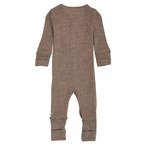 Härlig jumpsuit i mjuk merinoull med ribbstickning. Jumpsuiten knäpps framtill med tryckknappar och har vändbara fötter och händer. Dräkten är perfekt för små barn och håller dem varma och mysiga. De vändbara fötterna och händerna kan vikas efter behov. Denna jumpsuit finns i storlekarna 44-74 och passar därför mycket små barn. Tillverkad av mjuk 100 % merinoull i ribbstickning (GOTS-certifierad av Ecocert Greenlife Lic. nr 152033). Produkten är GOTS-certifierad, vilket innebär att bomullen är certifierad ekologisk och att alla andra processer, såsom färgning, stickning och sömnad, utförs med största hänsyn till miljön. GOTS är internationellt erkänt som den ledande standarden för bearbetning av ekologiska bomullstextilier. Dessutom tas hänsyn till arbetsförhållandena för dem som tillverkar kläderna. Ekologisk ull 100 %