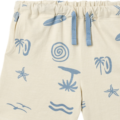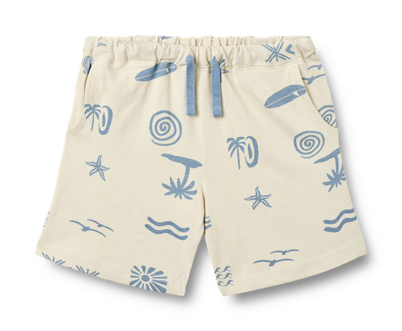 Kalle Jersey Shorts från Wheat är ett måste i sommarens garderob! Dessa shorts är tillverkade i en mjuk och stretchig bomullsblandning som ger maximal komfort och rörelsefrihet för aktiva barn. Det lekfulla trycket med palmer, surfbrädor och stjärnor ger en härlig semesterkänsla. Shortsen har en justerbar midja med dragsko och två praktiska sidofickor. Perfekta för både stranddagar och lek i parken – ett plagg som snabbt blir en favorit!